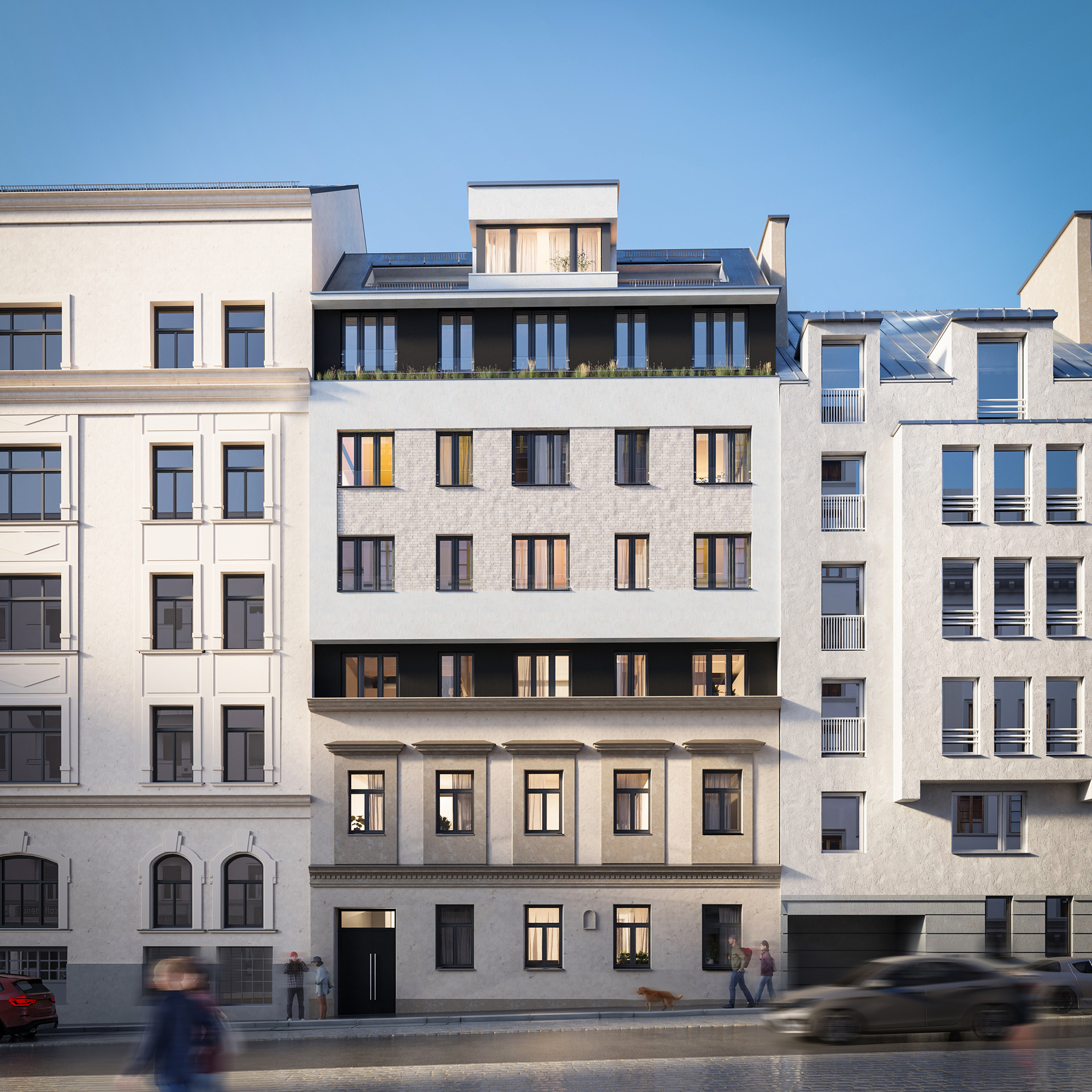 Das Erdgeschoß und 1. Stock bleiben im Bestand erhalten und werden umfassend modernisiert und saniert. Ab dem 2. Obergeschoß entstehen durch die Aufstockung des 3. und 4. Stocks sowie der beiden Dachgeschoß-Ebenen (DG 1 und DG 2) neue, helle Wohneinheiten mit funktionalen Grundrissen und großzügigen Freiflächen.